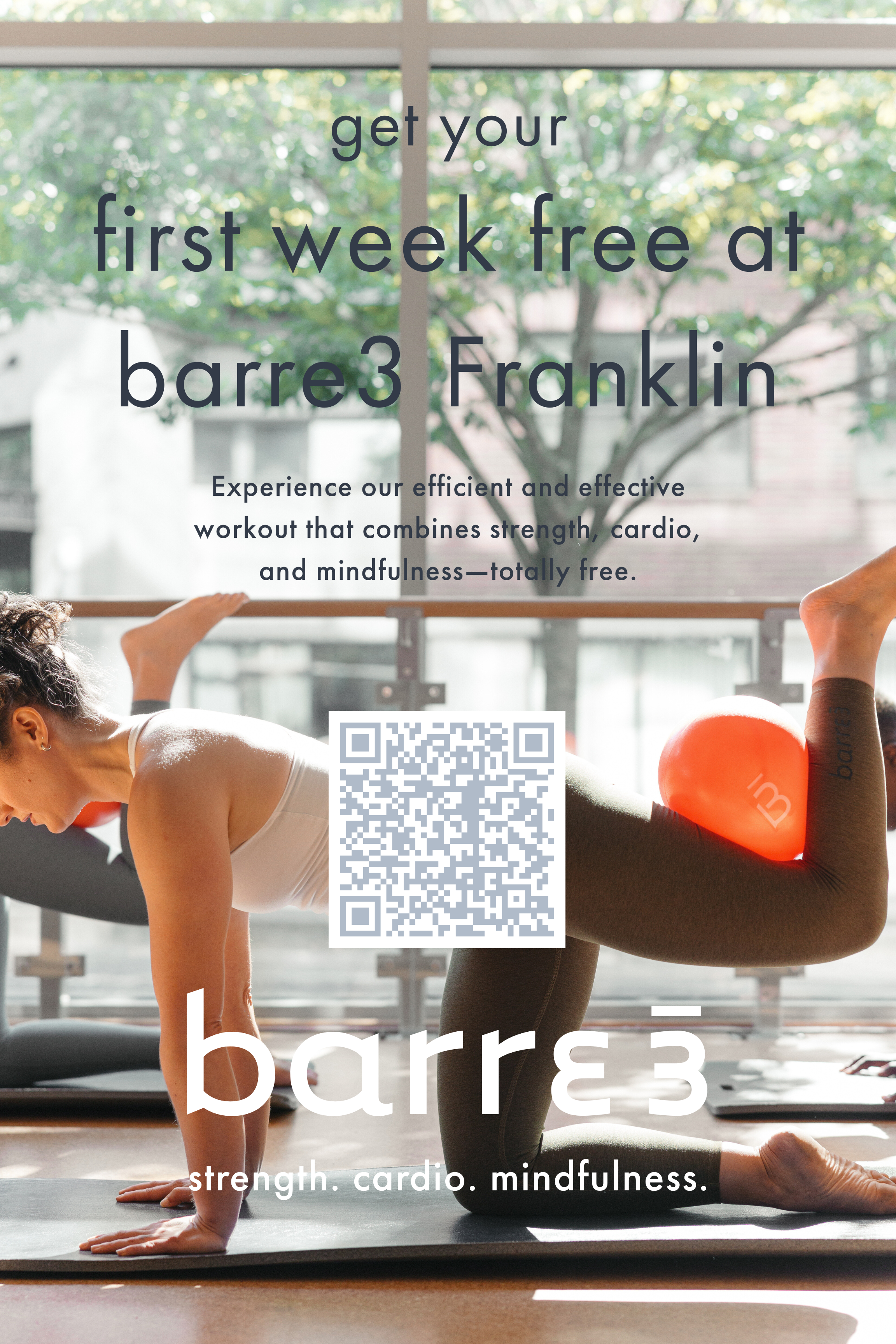 One Week of Unlimited classes at Barre3 Franklin - Whether you're brand new to barre3 or already a fan, this is the perfect chance to explore our class offerings, meet our team, and experience the strength, balance, and mindfulness that make barre3 so special. To activate your free week, create an account / log in and add a payment method (no charge applied for this offer). We look forward to meeting you!